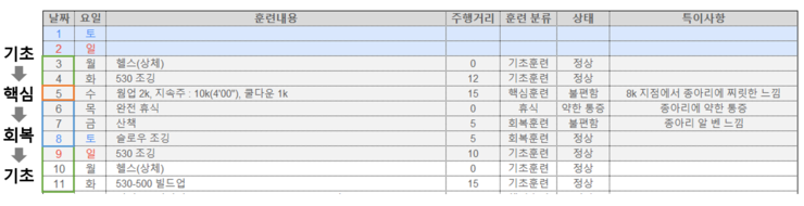 위와같이 1주일 단위 러닝 훈련을